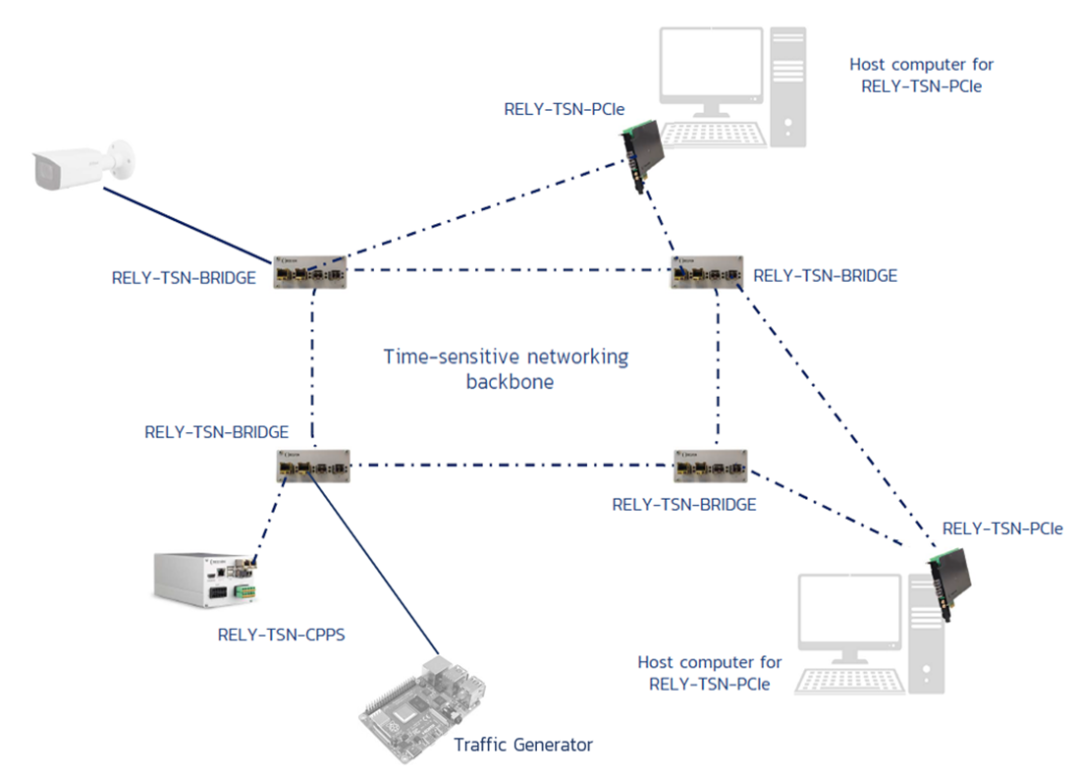 在图中有两个 TSNtalker。一边是安装在主机上的 RELY-TSN-PCIe 卡。该卡的功能与作为 listener 的 RELY-TSN-PCIe 卡的功能相同。在另一边,RELY-TSN-CPPS 设备也作为一个 talker。